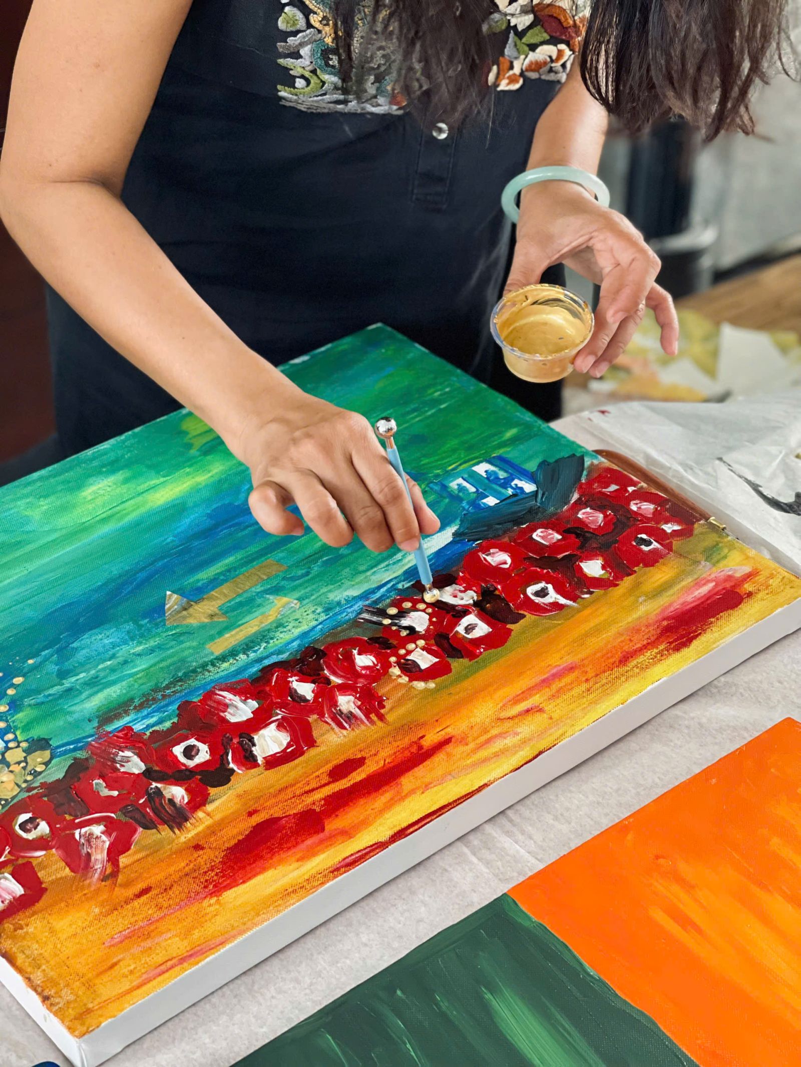 Trong đó, chuỗi workshop “A soulful exploration of painting and materials” được dẫn dắt bởi nghệ sĩ thị giác - hoạ sĩ Charlotte Sandrine Latour. Với hơn 15 năm kinh nghiệm cùng vốn văn hoá quốc tế rộng khắp, nghệ sĩngười Pháp này sẽ mang lại một không gian thú vị, với đa dạng phương pháp kết hợp màu sắc, chơi đùa với đa dạng vật liệu thường nhật mà bạn có thể áp dụng về sau, tại nhà. Đáng chú ý, từ 20028, workshop “Les Ateliers de Charlotte” ra đời tại Pháp, với mô hình “painting therapy workshop” chào đón khoảng 60 người từ trên 4 tuổi tham gia hàng tuần. Hoạt động này nhận được sự hưởng ứng đong đảo, và được nhận định là trải nghiệm cảm xúc đặc biệt. Workshop tại Đông Gia tiếp nối hoạt động này tại nhiều quốc gia khác ngoài quê hương cô ở Pháp. Do đó, kinh nghiệm kết nối cảm xúc với hội hoạ phong phú này giúp nghệ sĩ hướng dẫn mọi người tiếp cận cuộc đối thoại của nghệ thuật và