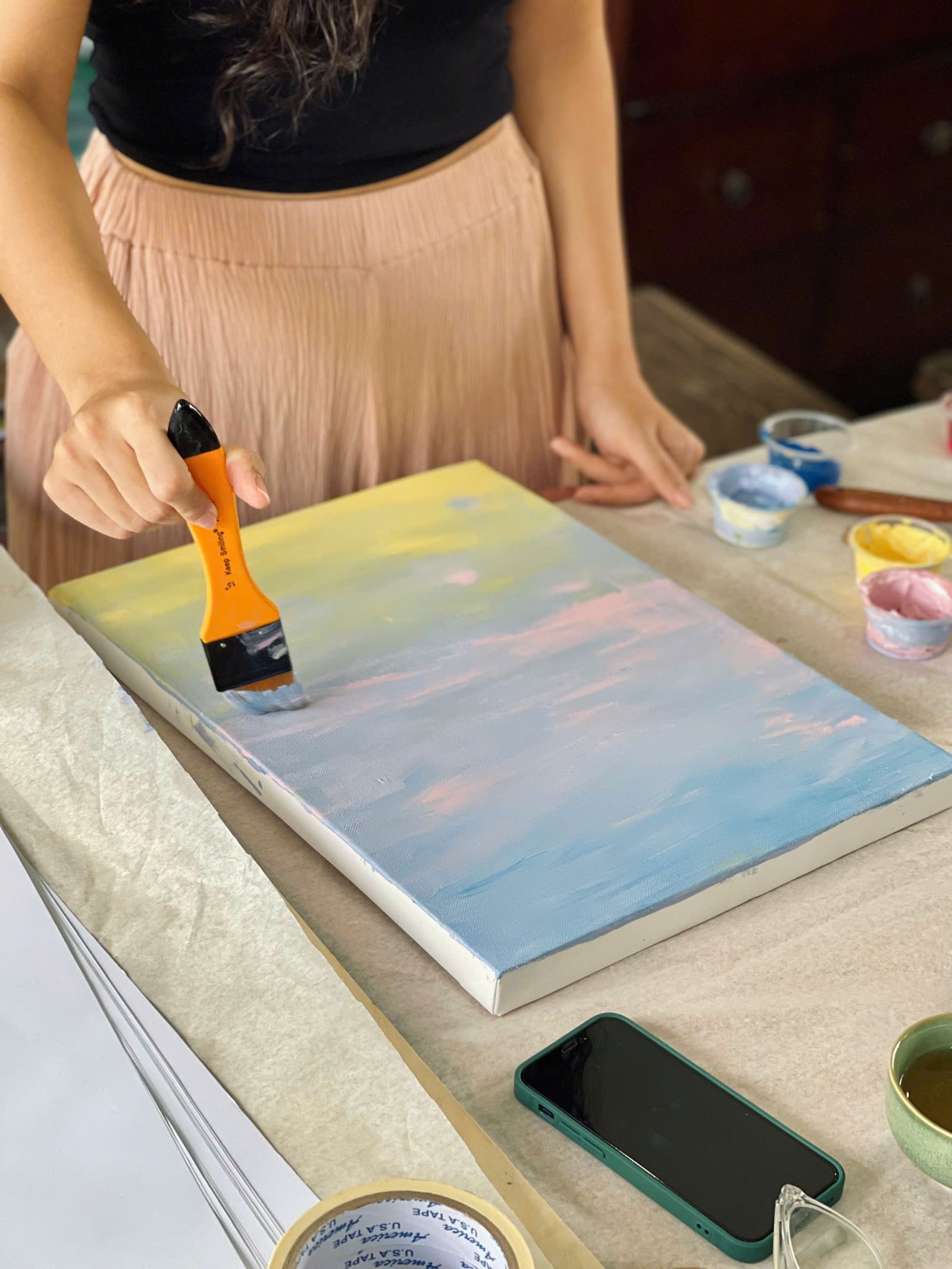 Từ cọ vẽ thông dụng, cọ sơn lớn, khăn giấy hay pay màu, tất cả đều có thể ứng dụng để làm nên những hoạ tiết đặc biệt, tạo thêm hiệu ứng cho tác phẩm riêng